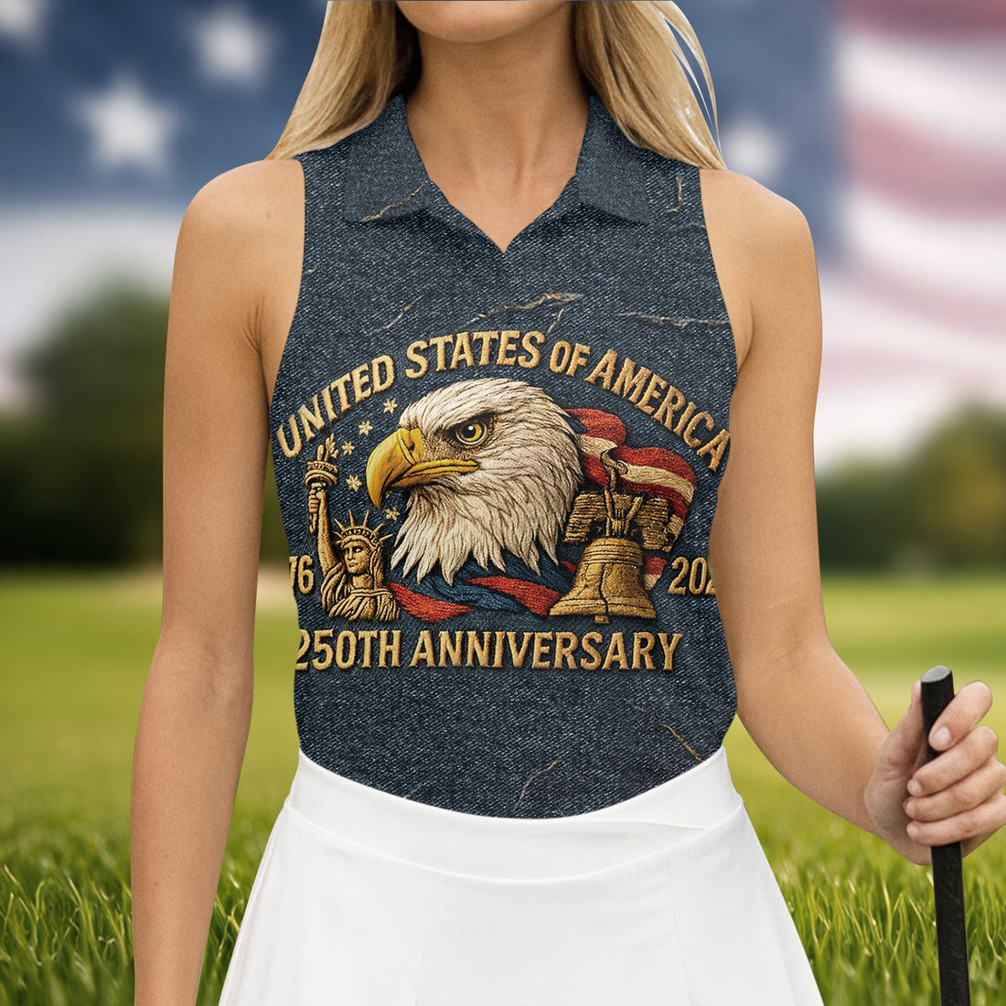 250th Anniversary American Flag And Eagle Denim Color Women's Golf Tops, Patriotic Golf Shirt, Ladies Golf Shirts