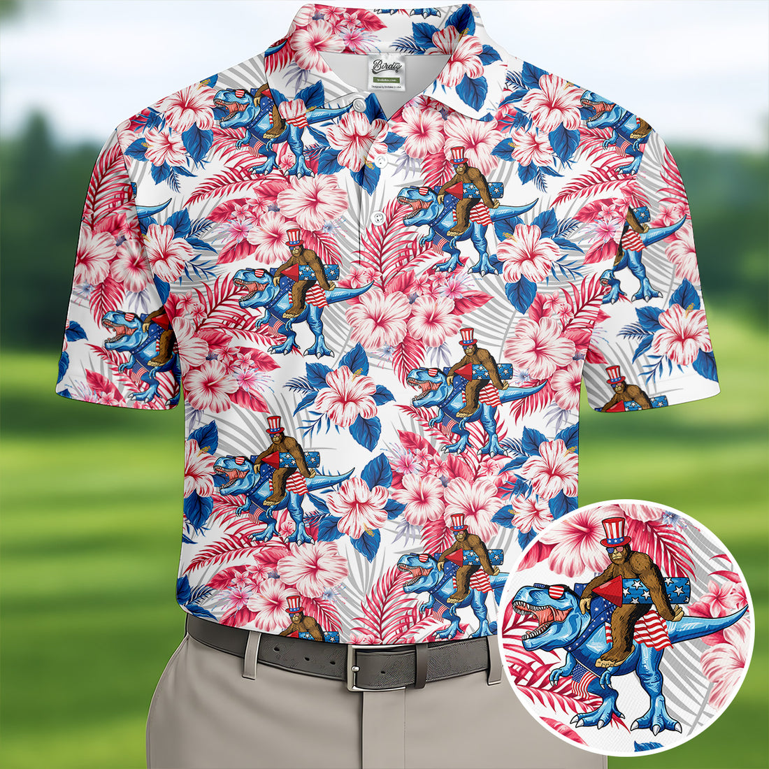 Patriotic T-Rex Bigfoot Hawaiian Floral Golf Shirt, 250 Years 4th Of July Golf Shirts For Men