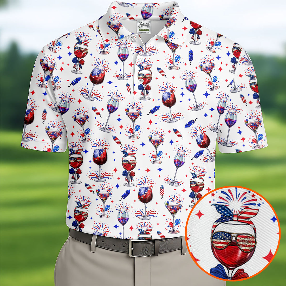 Wine And Martini American Flag Pattern Patriotic 4th Of July White Golf Shirt, 250th Anniversary Golf Shirts For Men