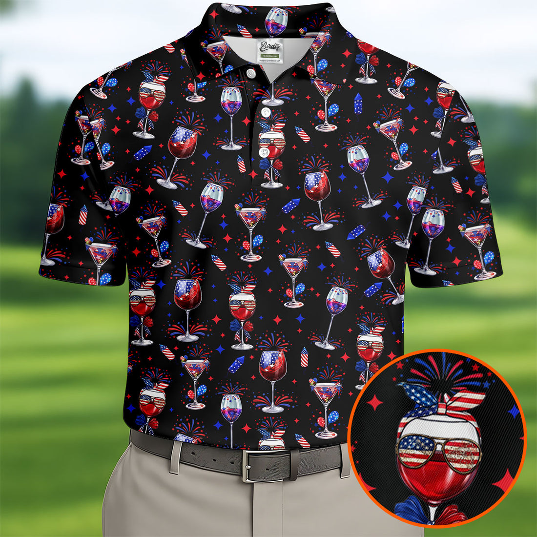 Wine And Martini American Flag Pattern Patriotic 4th Of July Black Golf Shirt, 250th Anniversary Golf Shirts For Men