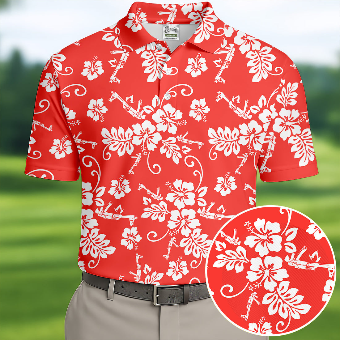 Tropical Flower Red Golf Shirt, Hawaiian Golf Shirt, Polo Shirts For Men, Golf Shirts For Men