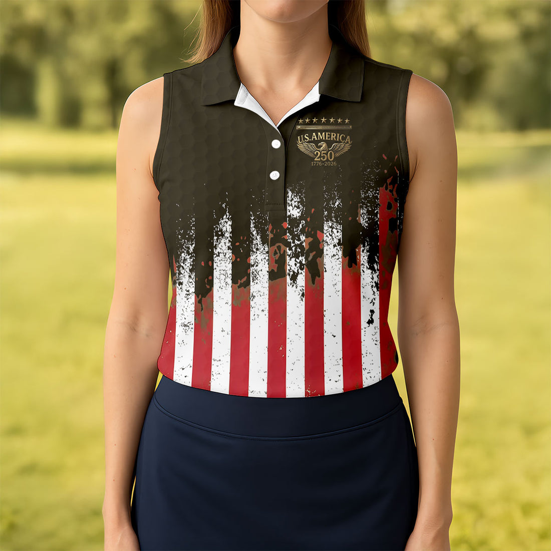 US Bald Eagle Golf Ball Pattern Distressed American Flag Women Golf Top, 250th Anniversary 4th Of July Golf Shirt