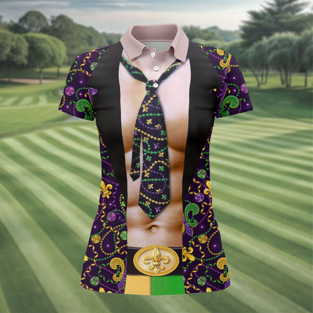 Mardi Gras Purple Green Gold Fleur De Lis Funny Costume Women's Golf Tops, Fun Women's Golf Shirts