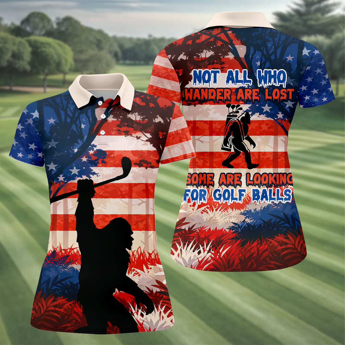 Not All Who Wander Are Lost Funny Bigfoot Golf Shirt For Women, 250th Patriotic Golf Shirt, Ladies Golf Shirts