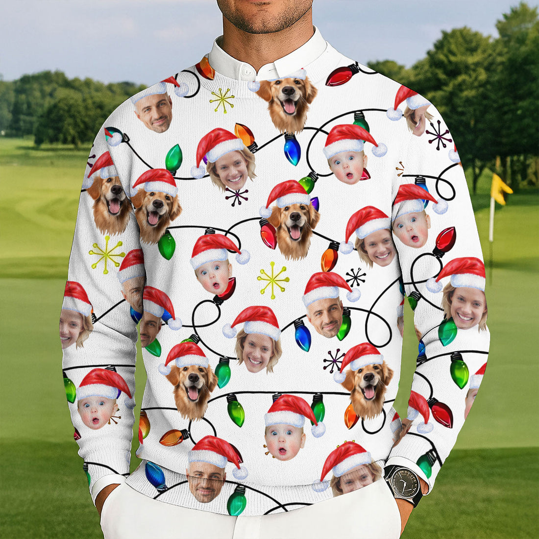Custom Family Portrait Christmas Lights Pattern Vintage Print Ugly Sweater, Christmas Golf Shirt, Golf Sweater