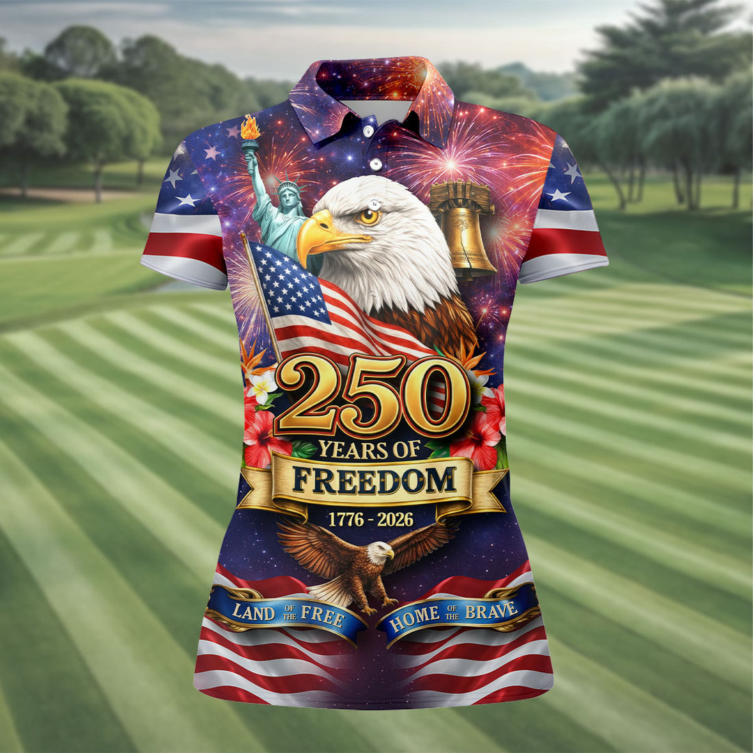 250 Years Of Freedom 1776-2026 American Flag Pattern Patriotic Golf Shirt, 250th Anniversary Golf Shirt For Women