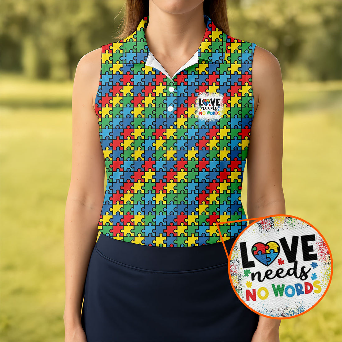 Love Needs No Words Autism Awareness Jigsaw Puzzle Pieces Golf Shirt For Women, Ladies Golf Polos
