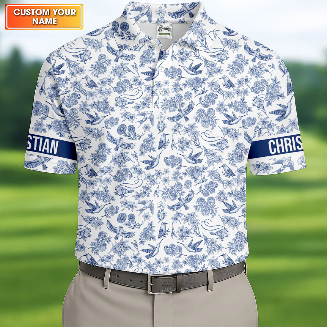 Custom Name Toile de Jouy Birds And Flowers Blue Golf Shirt, Polo Shirts For Men, Golf Gift For Men