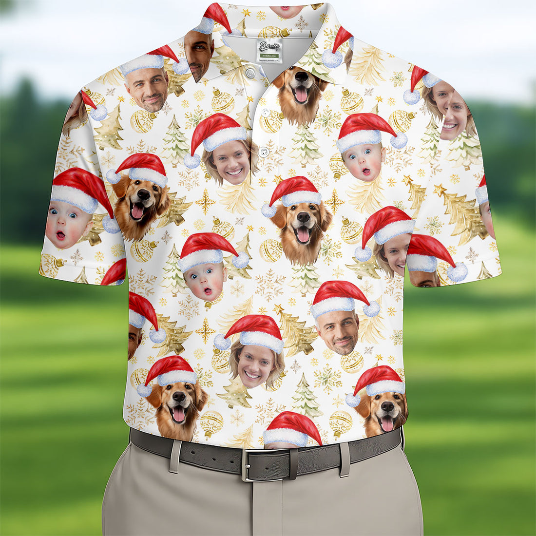Custom Face Xmas Pattern Golden Print Christmas Golf Shirt, Golf Gift For Men, Golf Shirts For Men