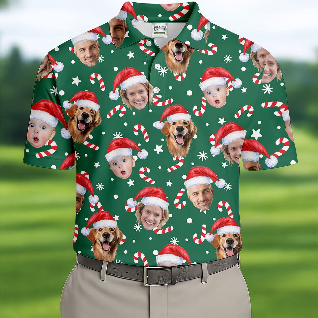 Custom Face Candy Cane Pattern Green Golf Shirt, Christmas Golf Shirt, Polo Shirts For Men, Golf Gift For Men