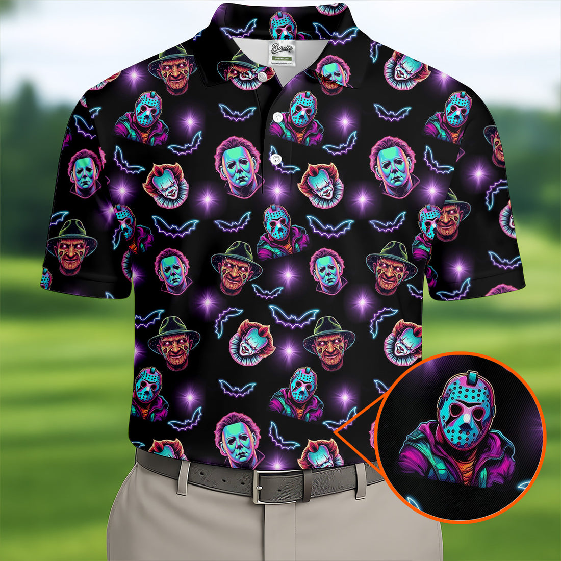 Funny Horror Movie Men's Golf Shirt, Horror Character Neon Shirt, Halloween Golf Shirt, Men Golf Gift