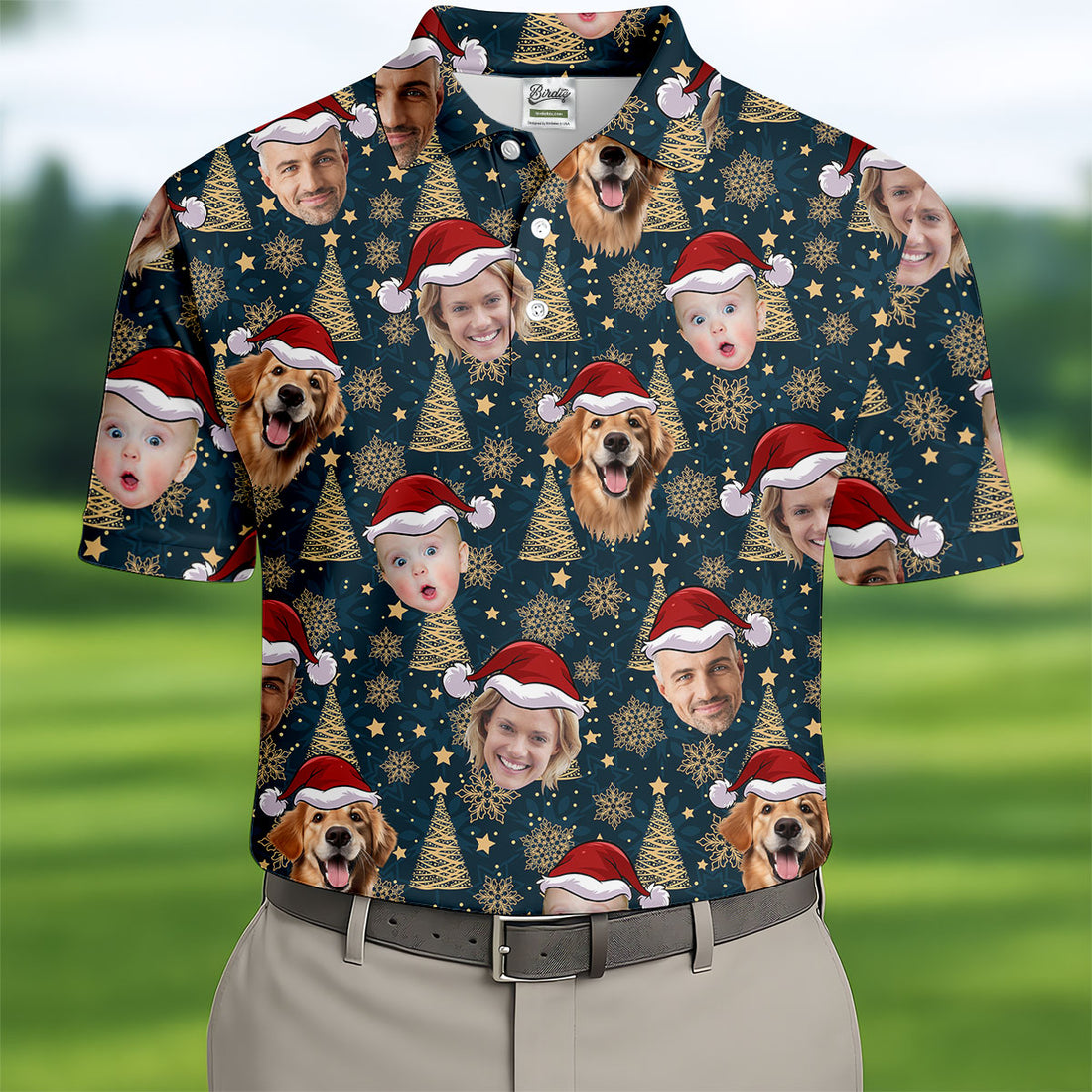 Custom Face Dark Blue And Gold Christmas Golf Tops For Men, Polo Shirts For Men, Christmas Golf Gift