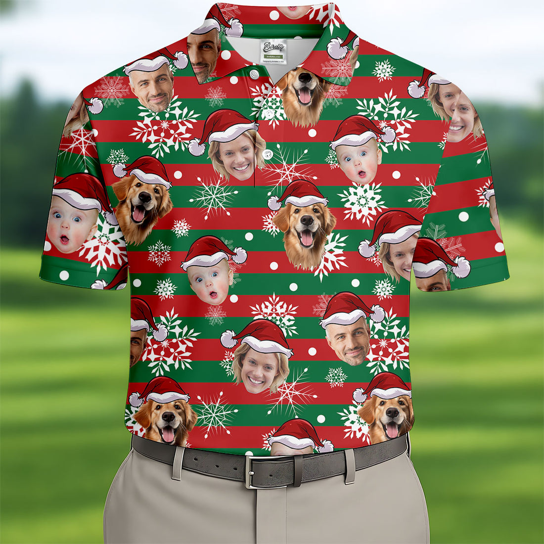 Custom Face Red Green Stripe Christmas Golf Tops For Men, Polo Shirts For Men, Christmas Golf Gift