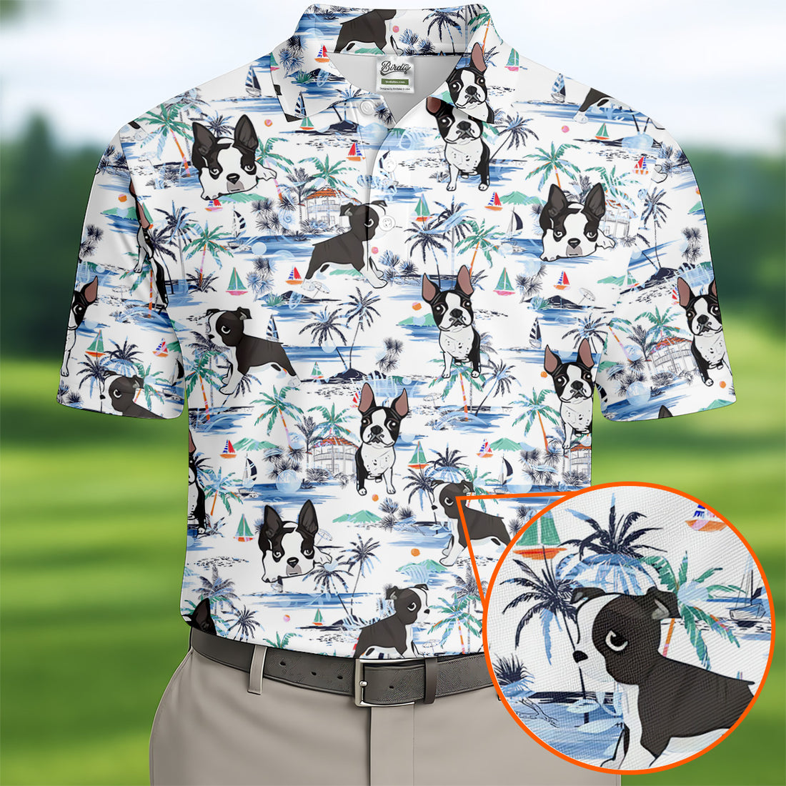Boston Terrier Ocean Vibe White Tropical Golf Shirts, Men's Funny Golf Shirts, Gifts For Dog Lovers