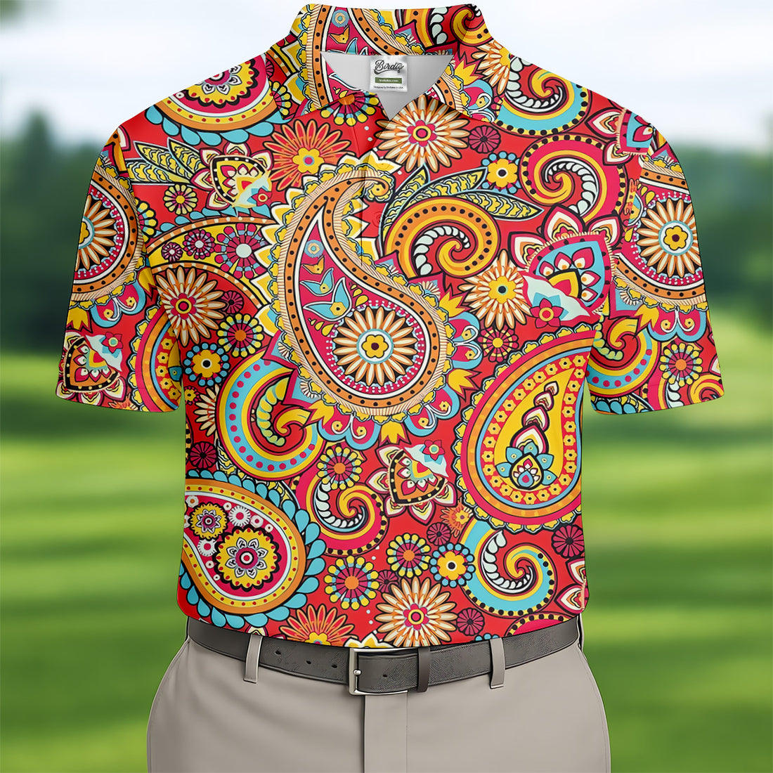 Red Paisley Seamless Pattern Golf Tops For Men, Hawaiian Golf Shirts, Long Sleeve Polo
