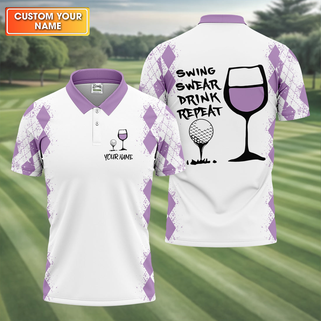 Swing Swear Drink Repeat Purple Argyle Golf Shirt, Fun Golf Shirts For Men, Men's White Polo