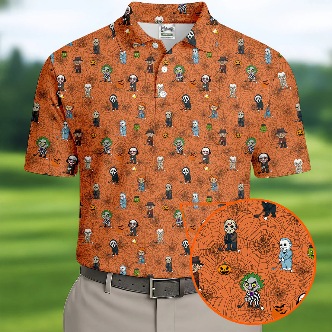 Funny Horror Character Orange Golf Polo Shirt, Horror Movie Shirt, Halloween Golf Shirt, Fun Golf Polos For Men