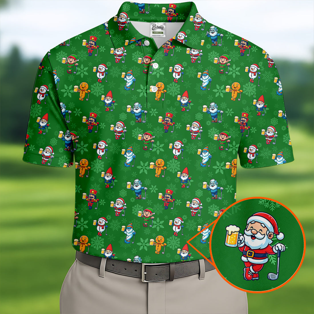 Christmas Characters Golf And Beer Green Men's Funny Golf Shirts, Christmas Golf Shirt, Polo Shirts For Men