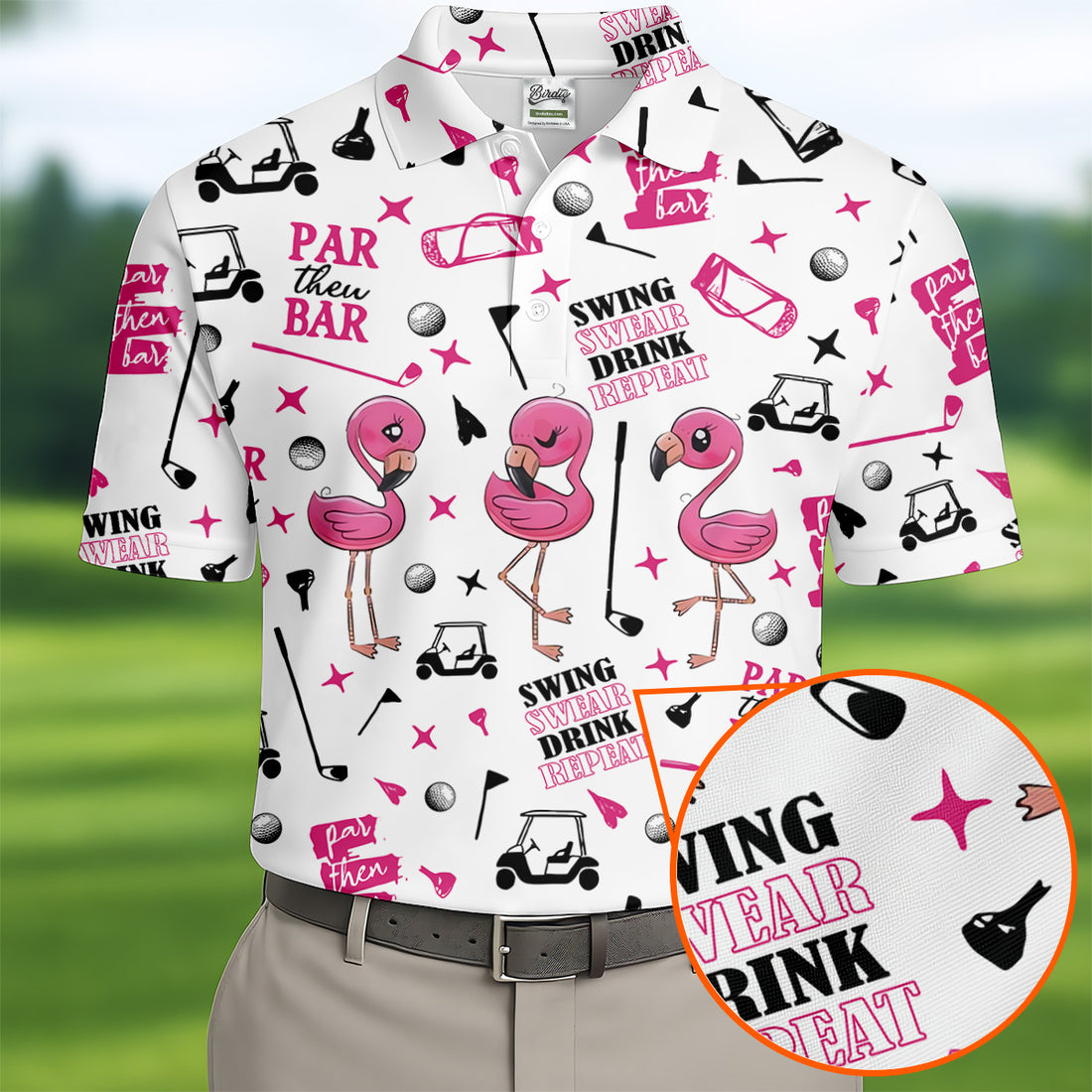 Swing Swear Drink Repeat Par Then Bar Flamingo Golf Shirt, Pink And White Fun Golf Shirts For Men