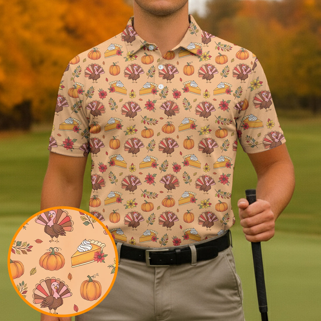 Cute Thanksgiving Turkey Pumpkin Pie Golf Tops For Men, Orange Golf Shirt, Thanksgiving Golf Gift For Men