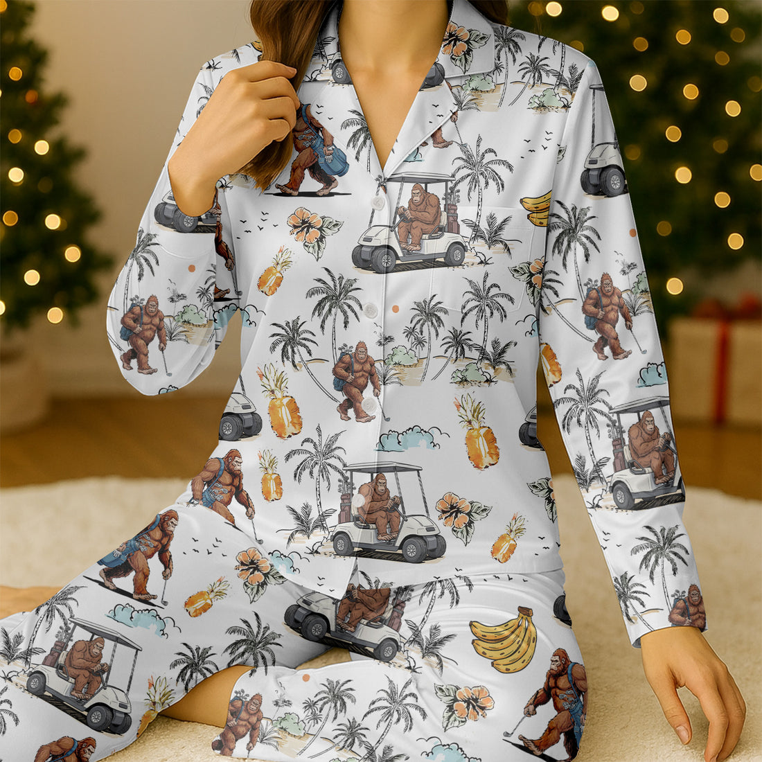 Funny Bigfoot Tropical Pajama, White Satin Pajama, Long Sleeve Pajama Set, Fun Pajama Sets