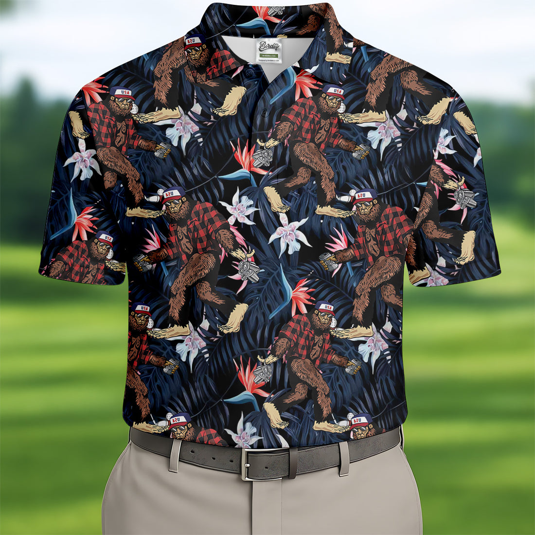 Abstract Floral Pattern Funny Bigfoot Shirt, Mens Golf Polo Shirts, Cool Golf Gifts, Golfing Apparel