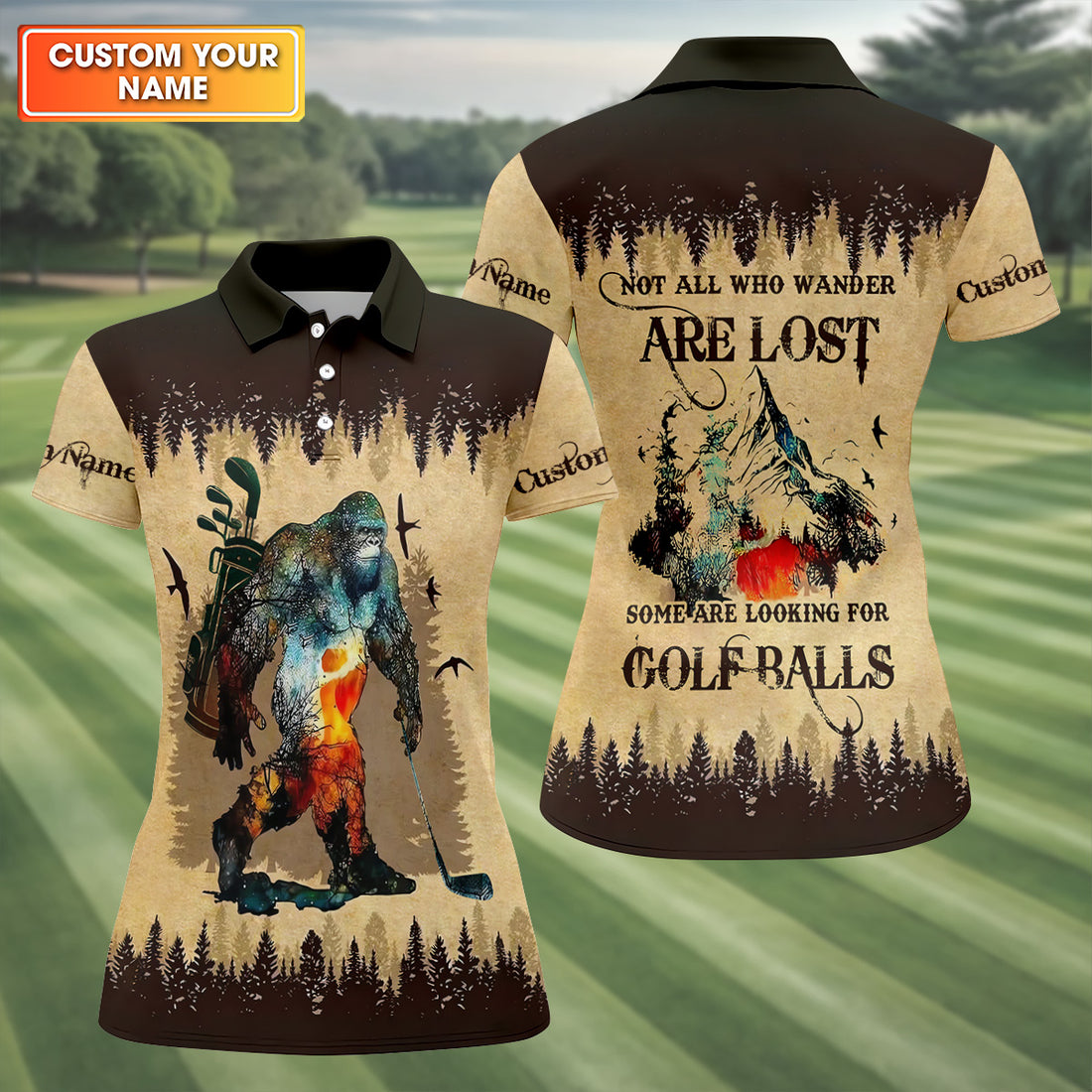 Not All Who Wander Are Lost Funny Bigfoot Brown Golf Shirt, Womens Golf Shirts, Ladies Golf Polos