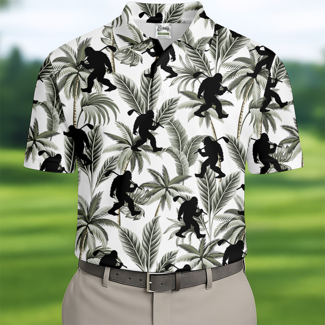 Funny Bigfoot Tropical Palm Leaves Golf Tops For Men, Custom Golf Polos, Golf Gift For Men
