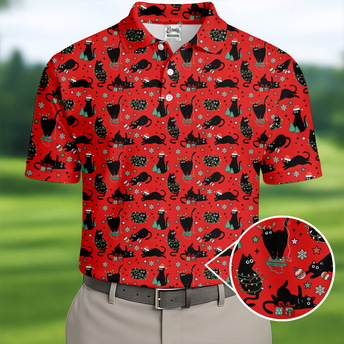 Xmas Black Cat Red Golf Shirt, Polo Shirts For Men, Christmas Golf Shirt, Golf Gift For Men, Christmas Golf Gift