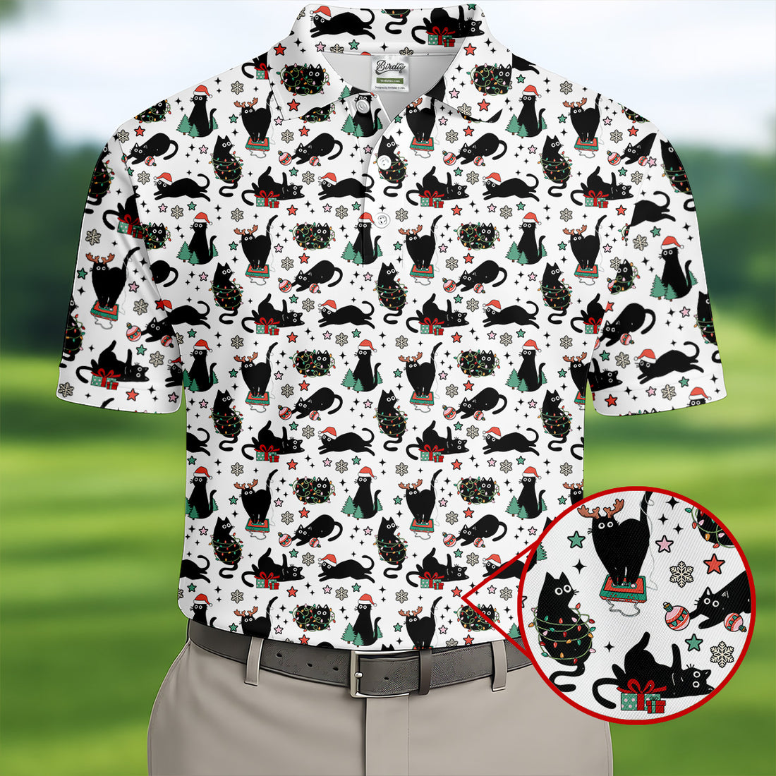 Xmas Black Cat Polo Shirts For Men, Christmas Golf Shirt, Golf Gift For Men, Christmas Golf Shirt