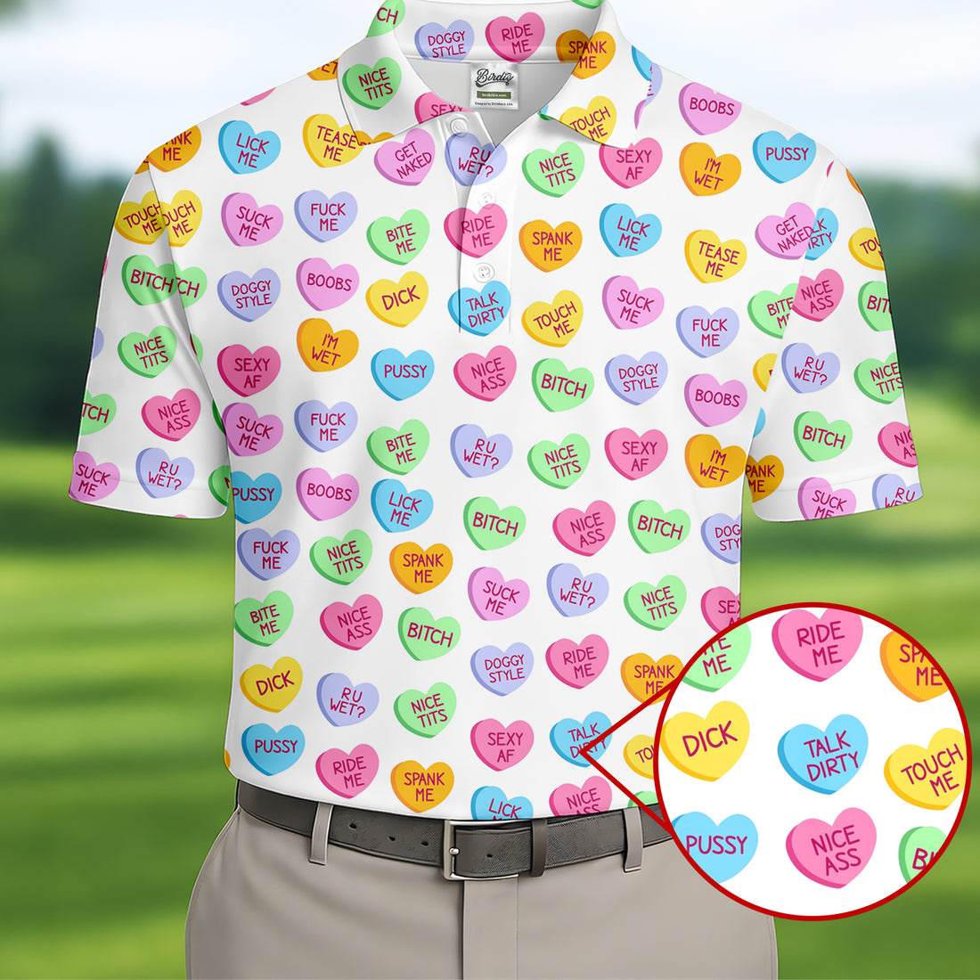 Naughty Conversation Hearts Fun Golf Shirts For Men, Valentines Golf Gift, Dirty Candy Heart Polo Shirts For Men