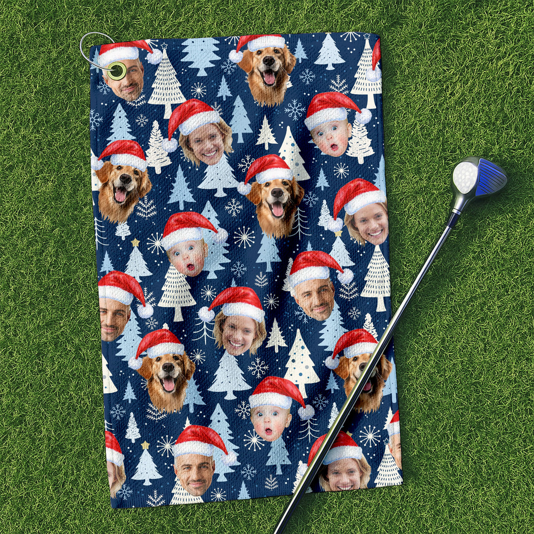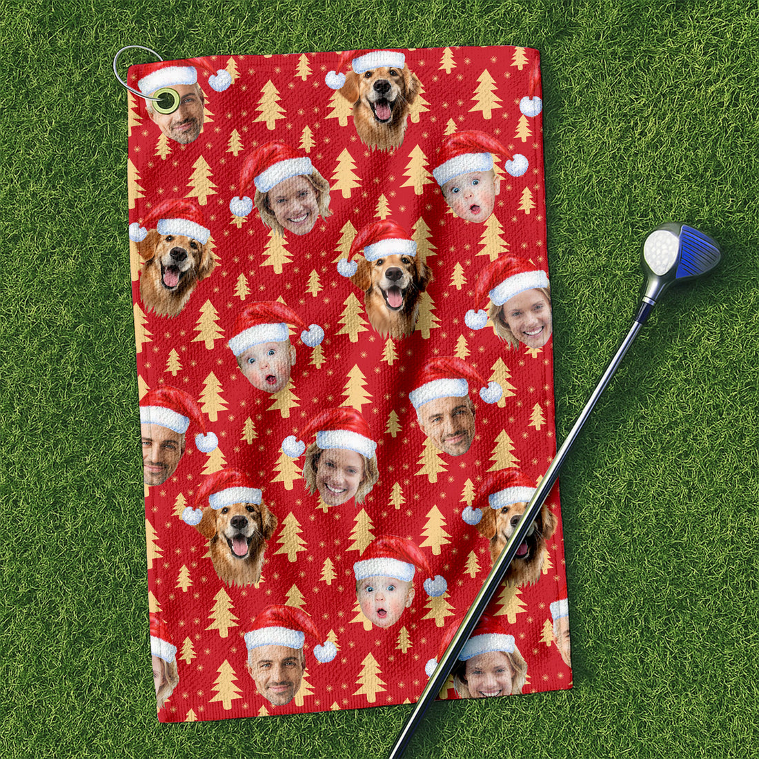 Custom Face Golden Pine Tree Red Golf Towels, Christmas Golf Gift, Custom Golf Accessories