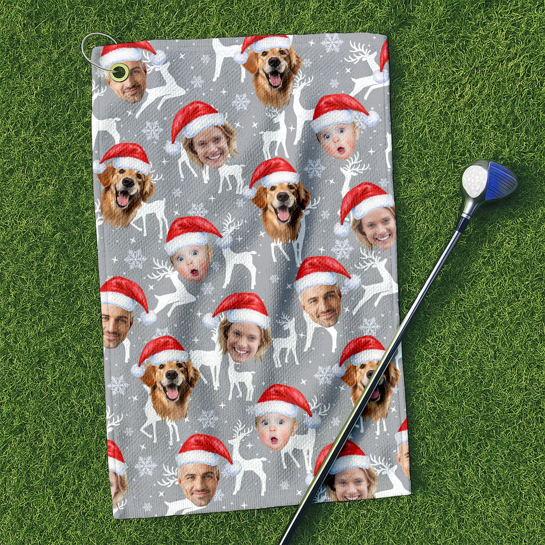 Custom Face Snow Reindeer Grey Golf Towels, Christmas Golf Gift, Custom Golf Accessories