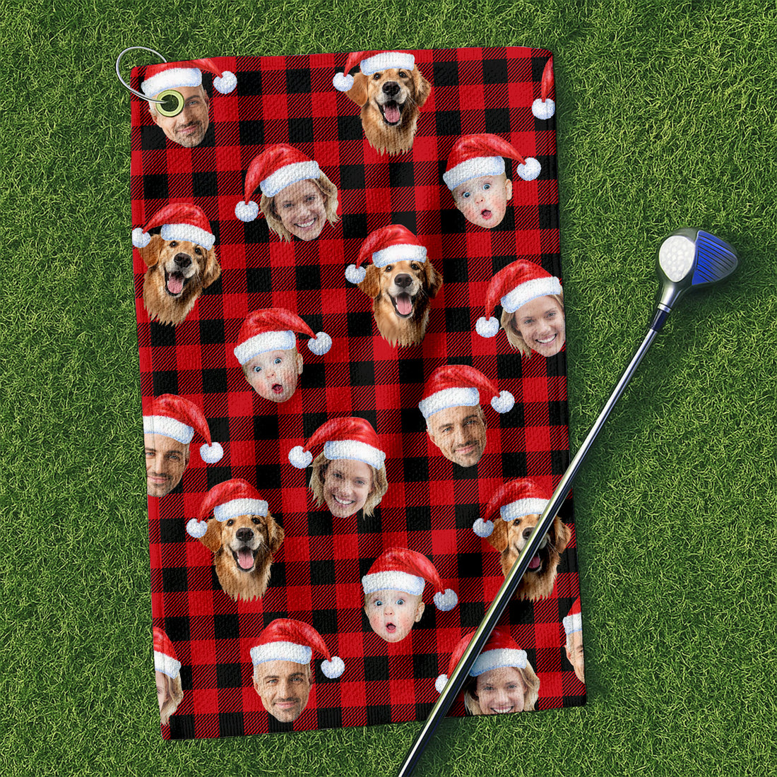 Custom Face Black And Red Checkered Golf Towels, Christmas Golf Gift, Custom Golf Accessories