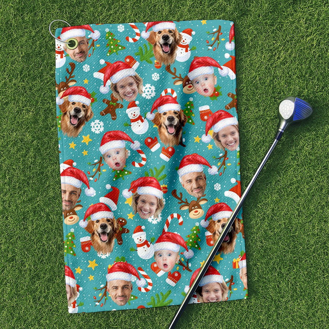 Custom Face Cute Christmas Pattern Teal Golf Towels, Christmas Golf Gift, Custom Golf Accessories