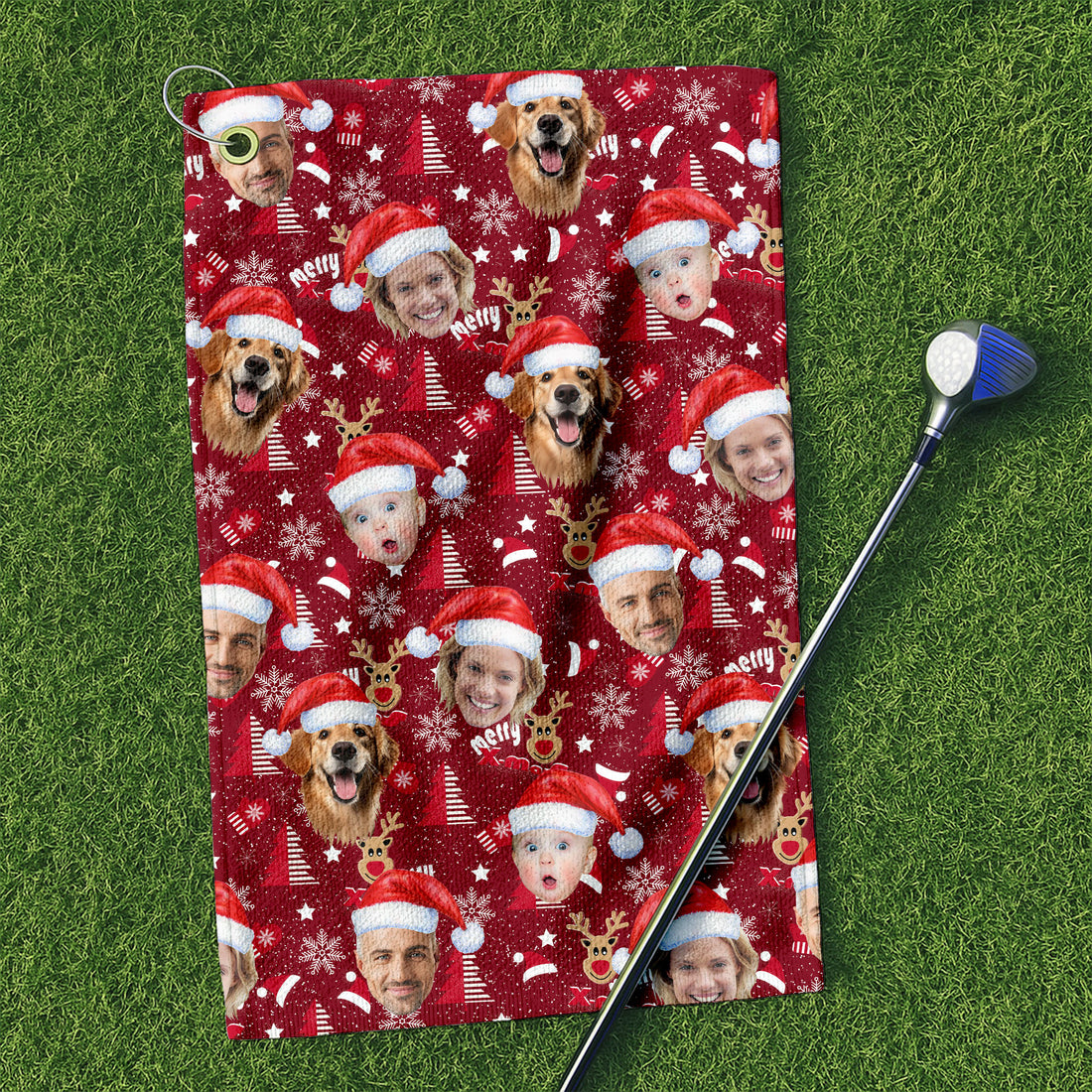 Custom Face Red Nose Reindeer Merry Xmas Red Golf Towel, Christmas Golf Gift, Golf Gift Idea