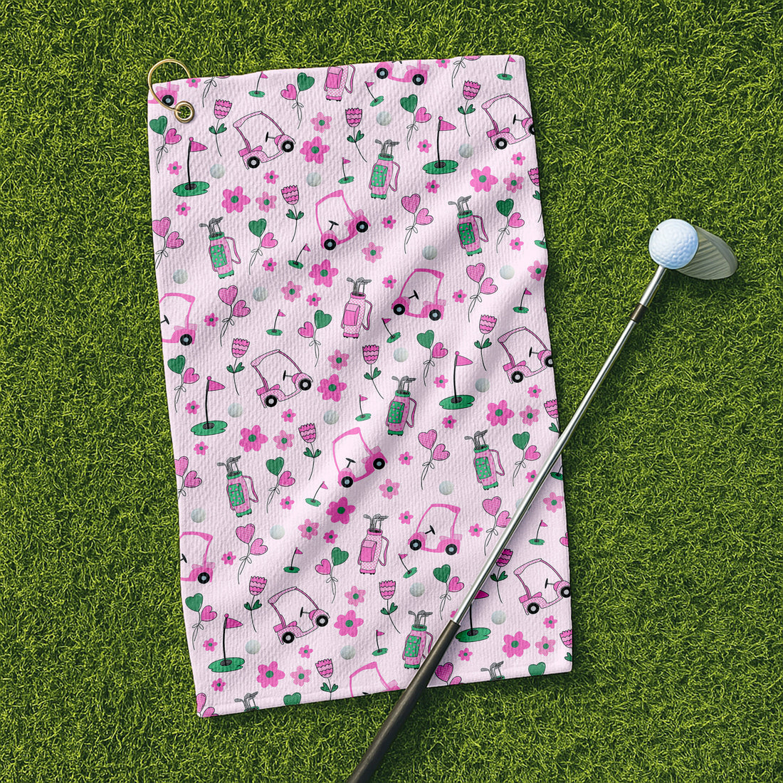 Pink Green Golf Towel With Golf Cart Doodle, Unique Gift For Golfer, Christmas Golf Gift, Golf Accessories