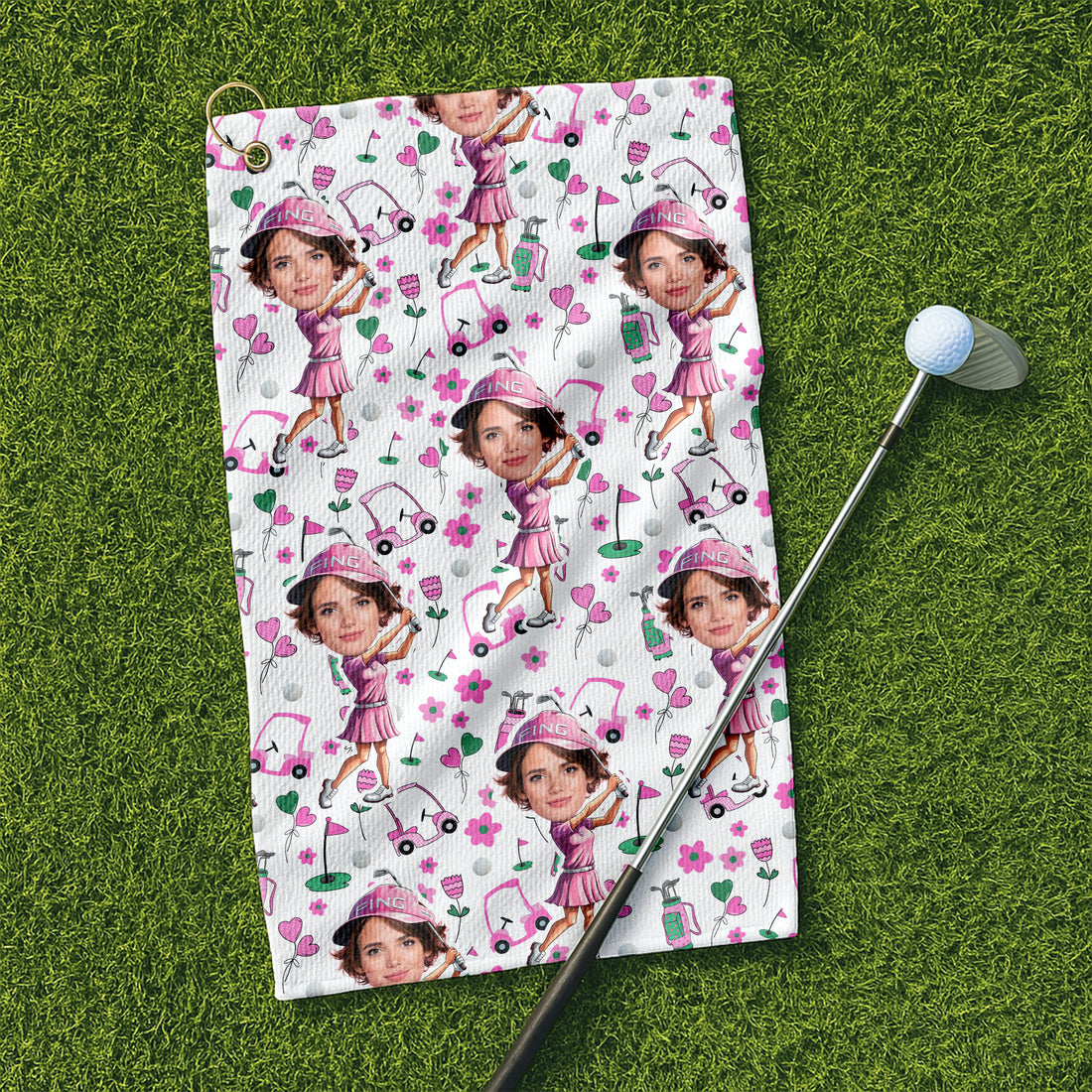 Custom Face Pink Green Golf Towel With Golf Cart Doodle, Unique Gift For Golfer, Christmas Golf Gift