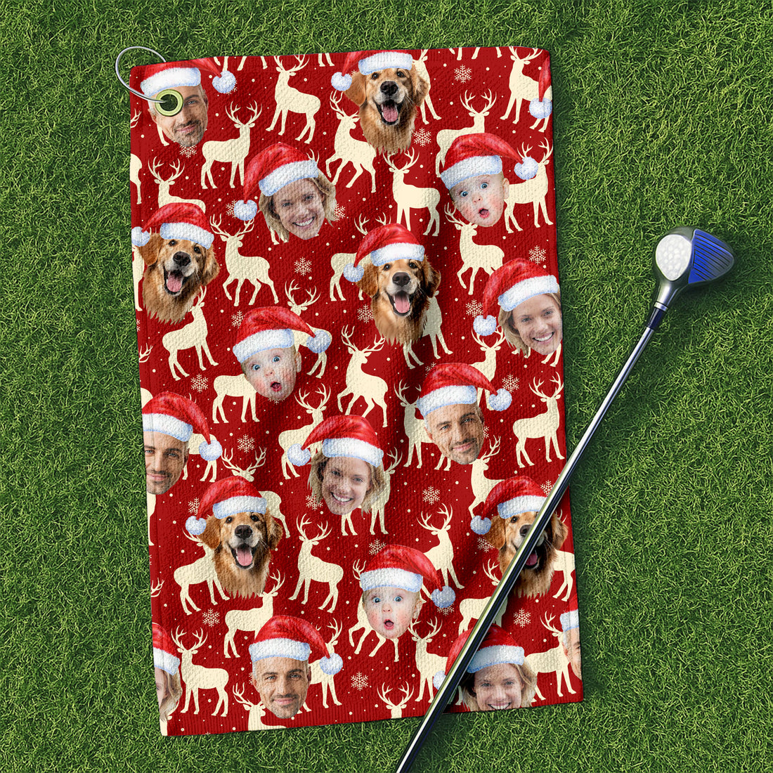 Custom Face Reindeer Pattern Beige And Red Golf Towels, Christmas Golf Gift, Custom Golf Accessories
