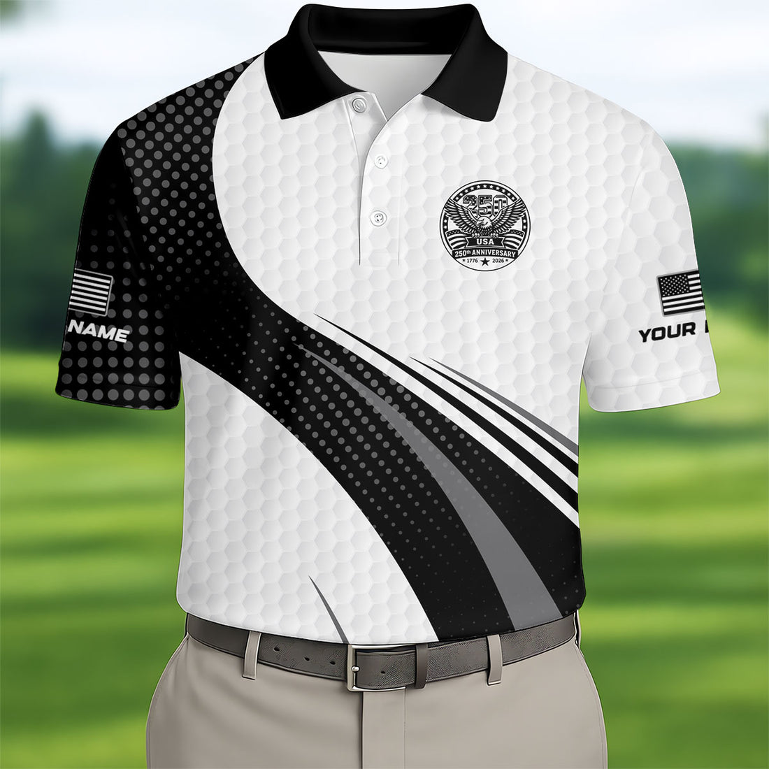 USA 250th Anniversary Black And White Golf Ball Pattern Golf Tops For Men, Patriotic Golf Shirts For Men