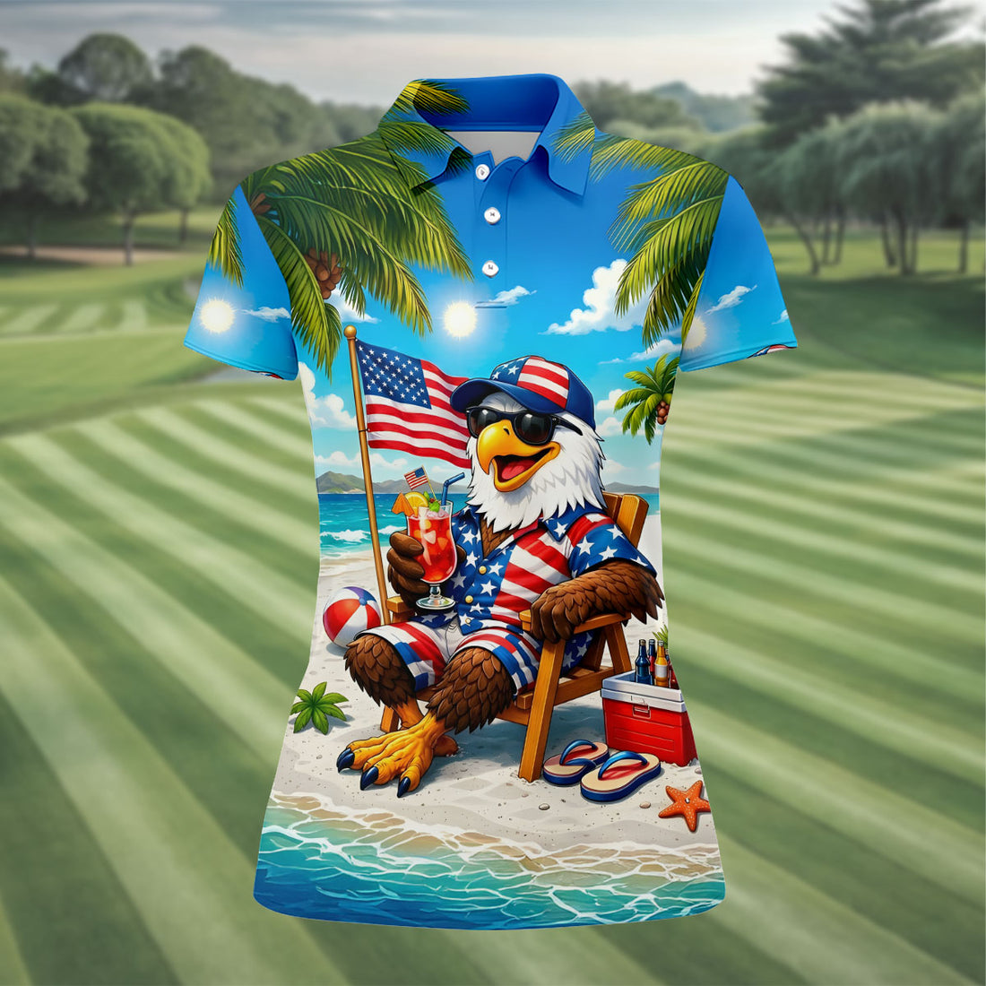 Funny Bald Eagle US Flag Pattern Hawaiian Golf Shirt, 250 Years Patriotic 4th Of July Golf Shirt For Women