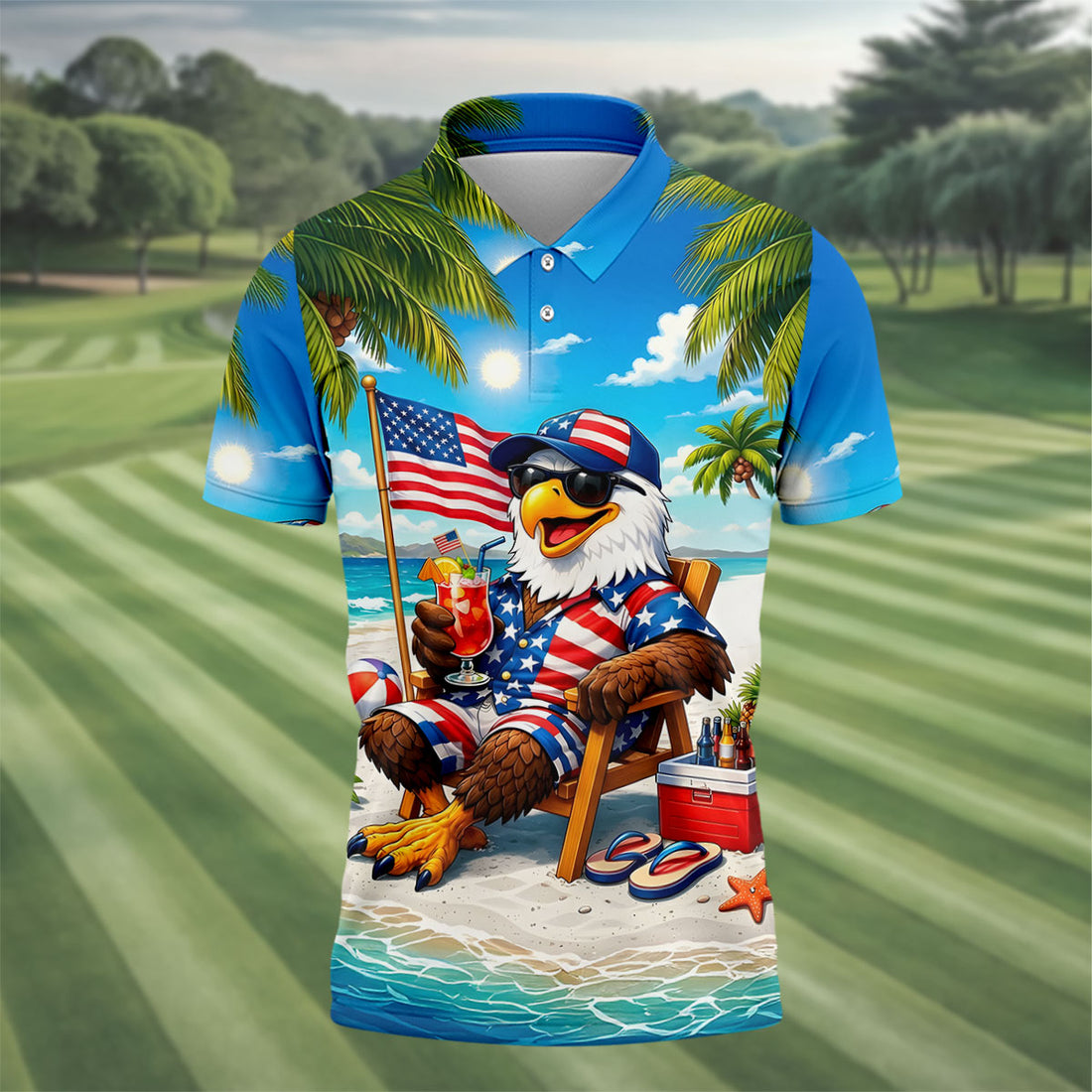 Funny Bald Eagle US Flag Pattern Hawaiian Golf Shirt, 250 Years Patriotic 4th Of July Golf Shirts For Men