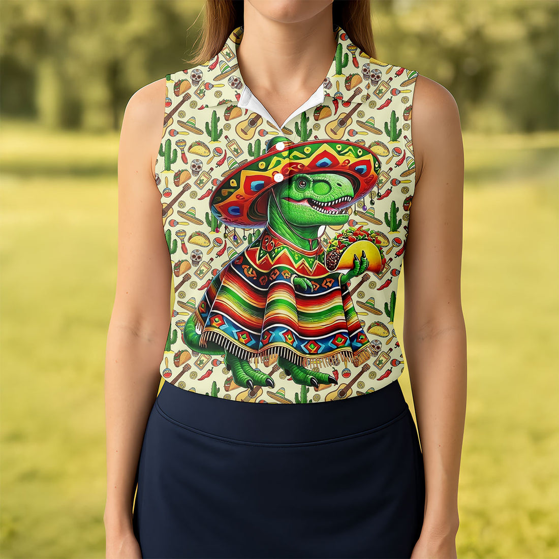 Dinosaur Taco Fiesta Time Ladies Golf Tops, Cinco De Mayo Celebration Golf Shirt For Women