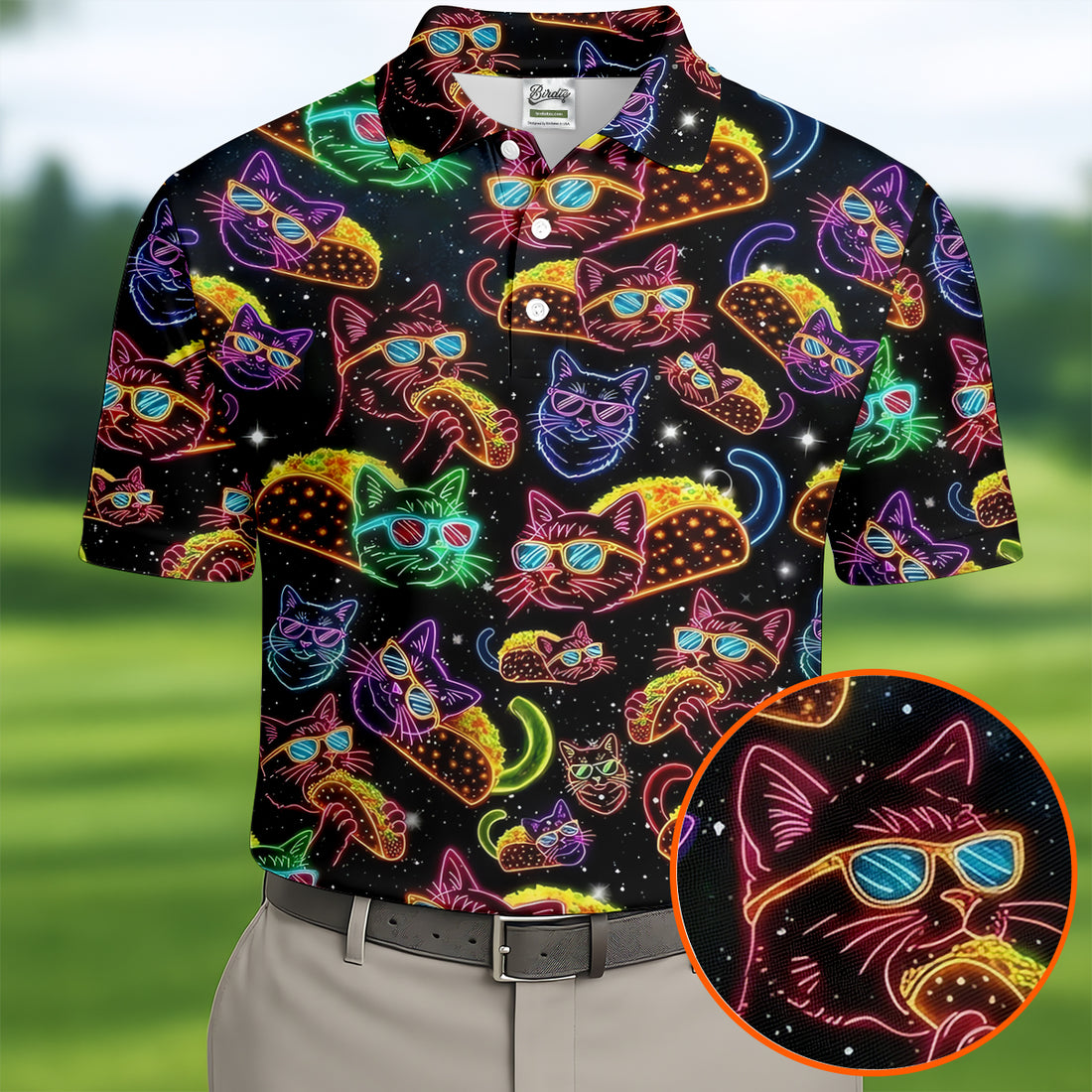 Neon Cat Taco Fiesta Time Hawaiian Golf Shirt, Cinco De Mayo Celebration Golf Shirts For Men