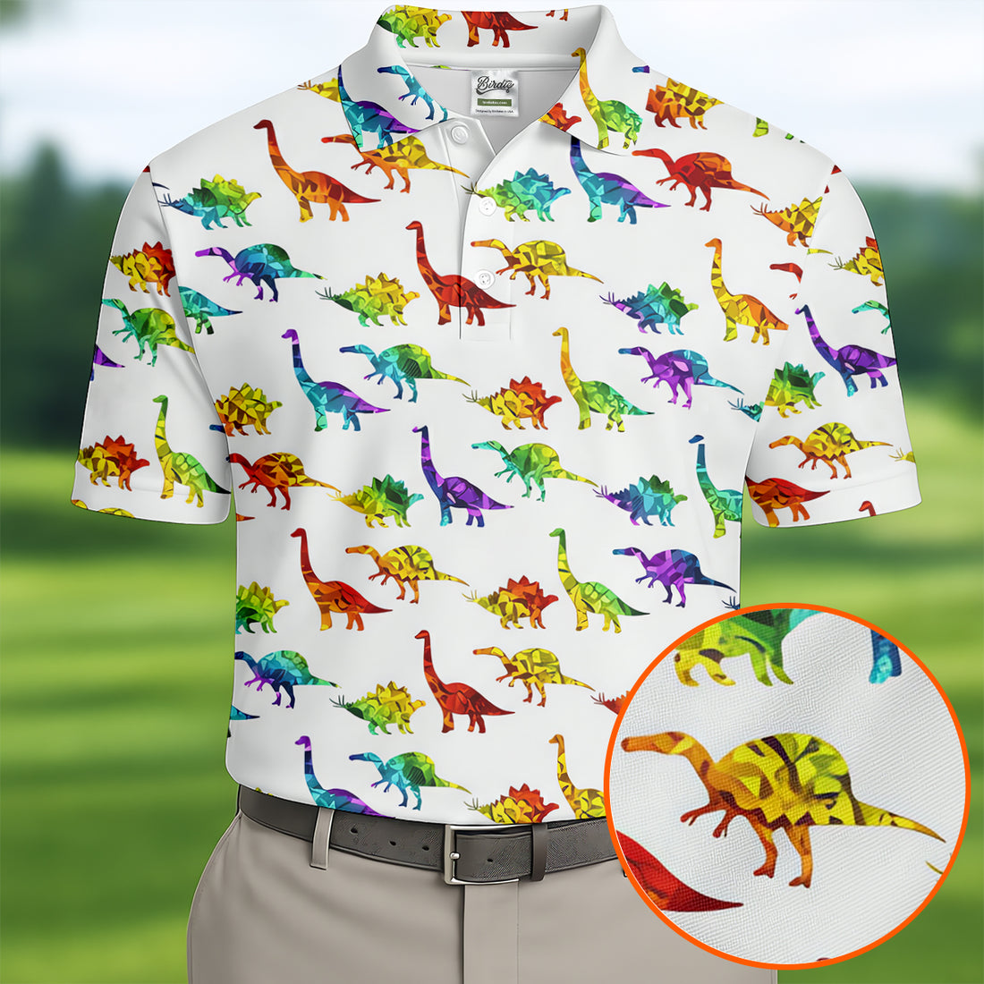 Colorful Dinosaur White Golf Shirt, Golf Tops For Men, Golf Shirts For Men, Polo Shirts For Men