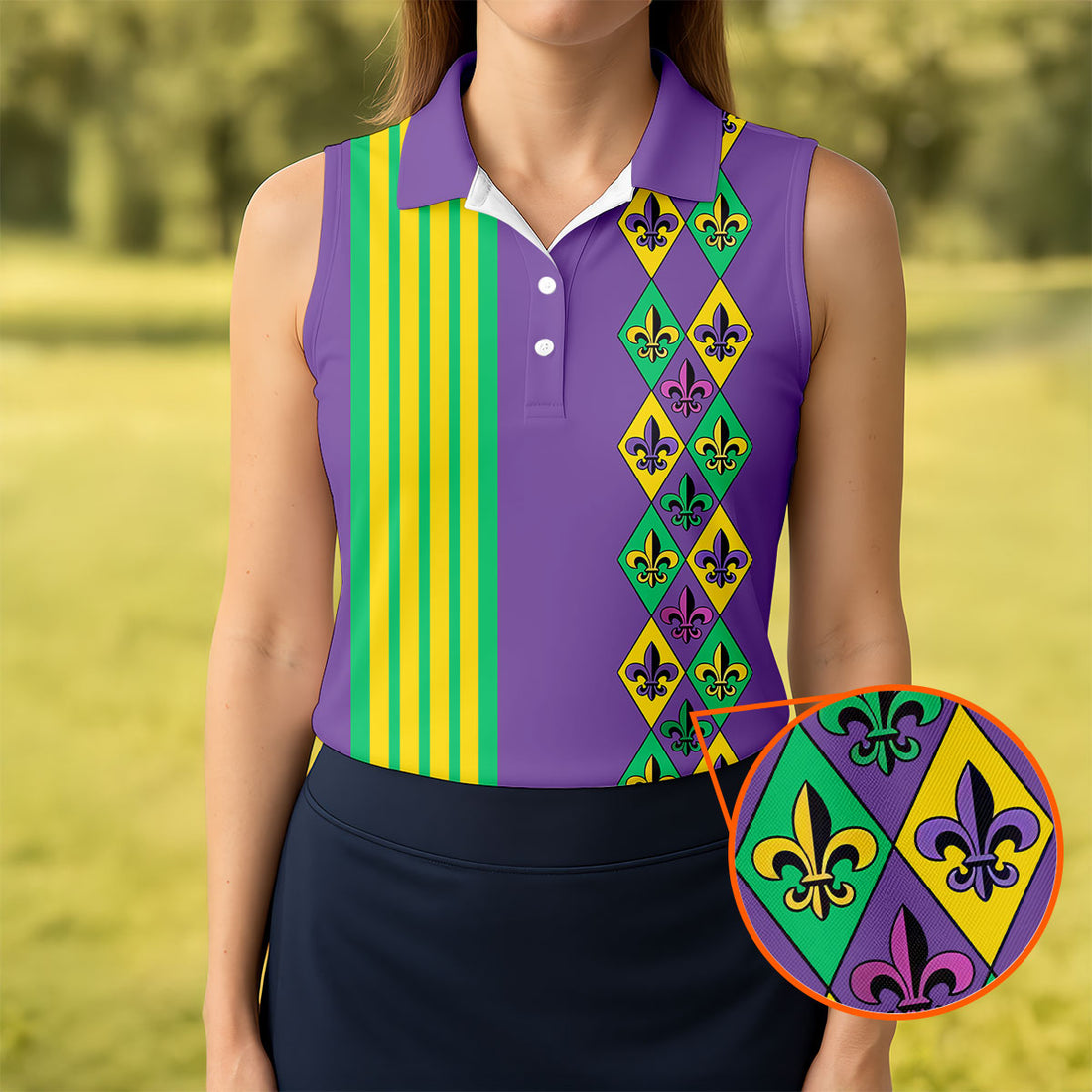 Fleur De Lis Argyle Pattern Purple Green Gold Stripes Women's Golf Shirts, Ladies Golf Polos, Golf Shirt For Women