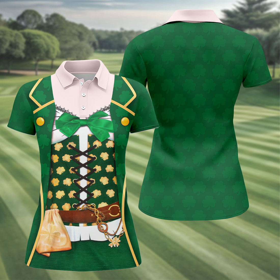 St Patrick's Day Green Leprechaun Costume Print Golf Shirt, Ladies Golf Polos, Golf Shirt For Women