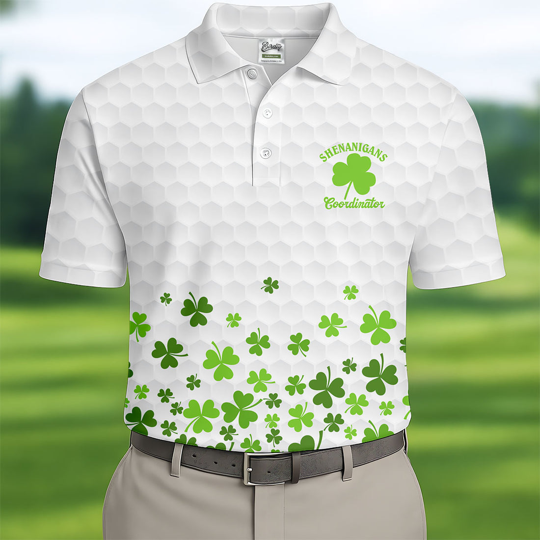 Shenanigans Coordinator Golf Ball Pattern St Patrick Day White Golf Shirt, Golf Tops For Men, Golf Shirts For Men