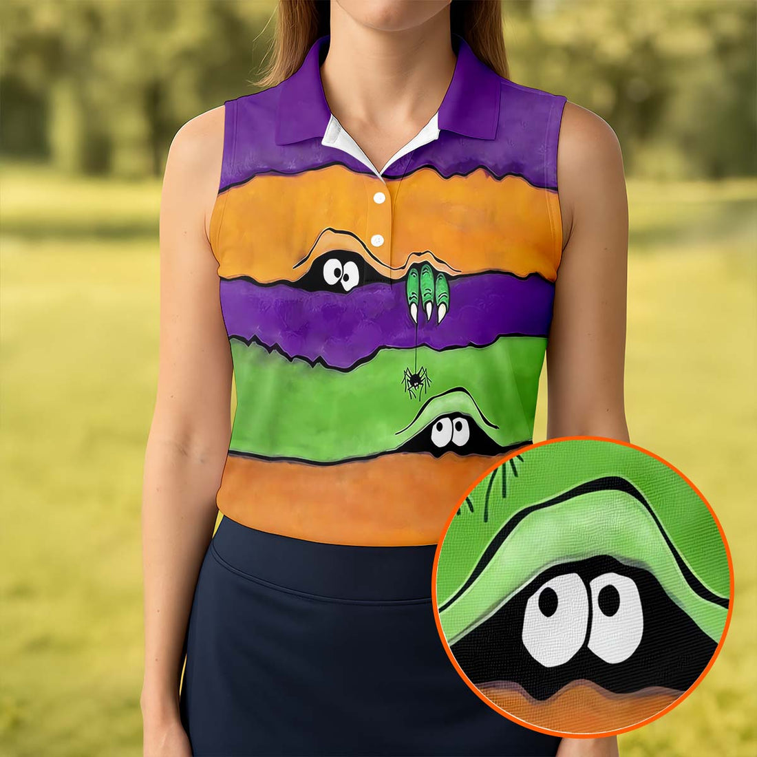 Funny Halloween Peeping Eyes Ladies Golf Polos, Women's Golf Tops, Halloween Golf Shirt