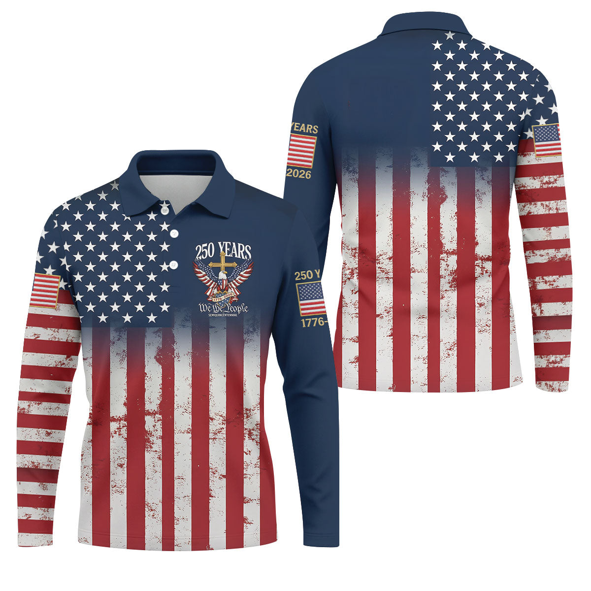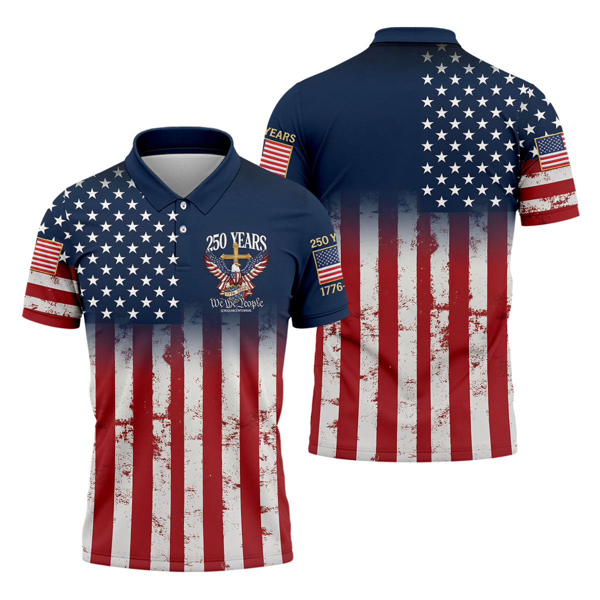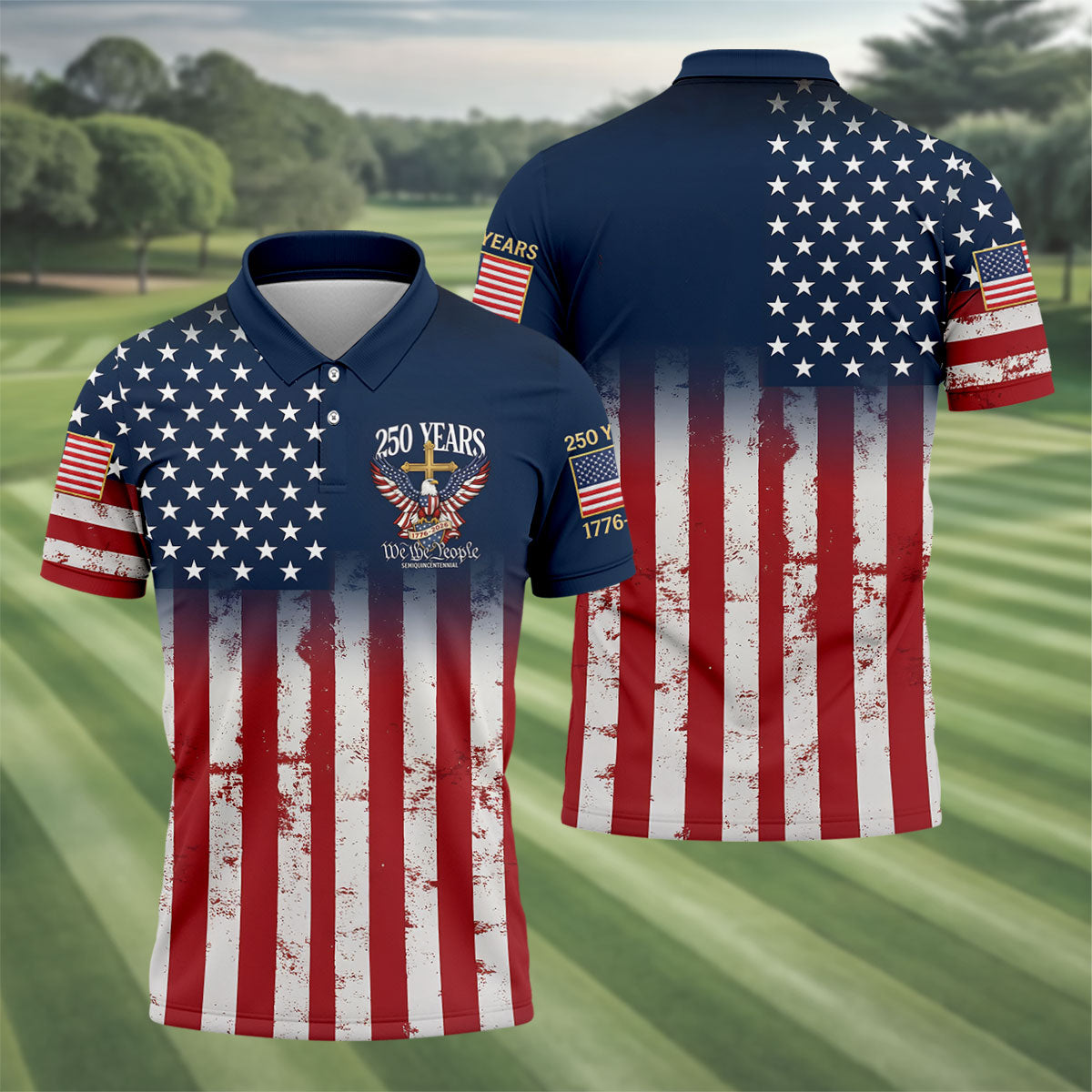 250 Years We The People Bald Eagle US Flag Cross Faith Golf Shirts For Men, Patriotic Golf Shirt